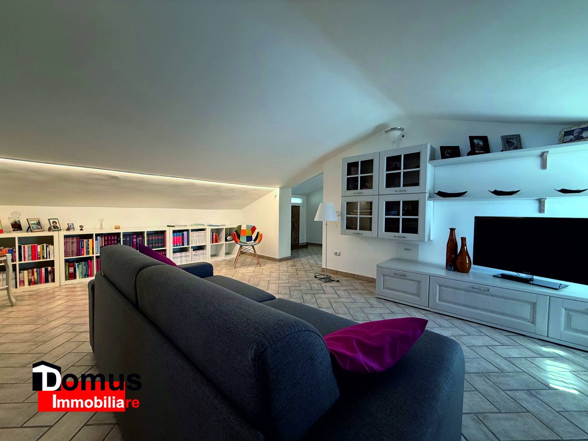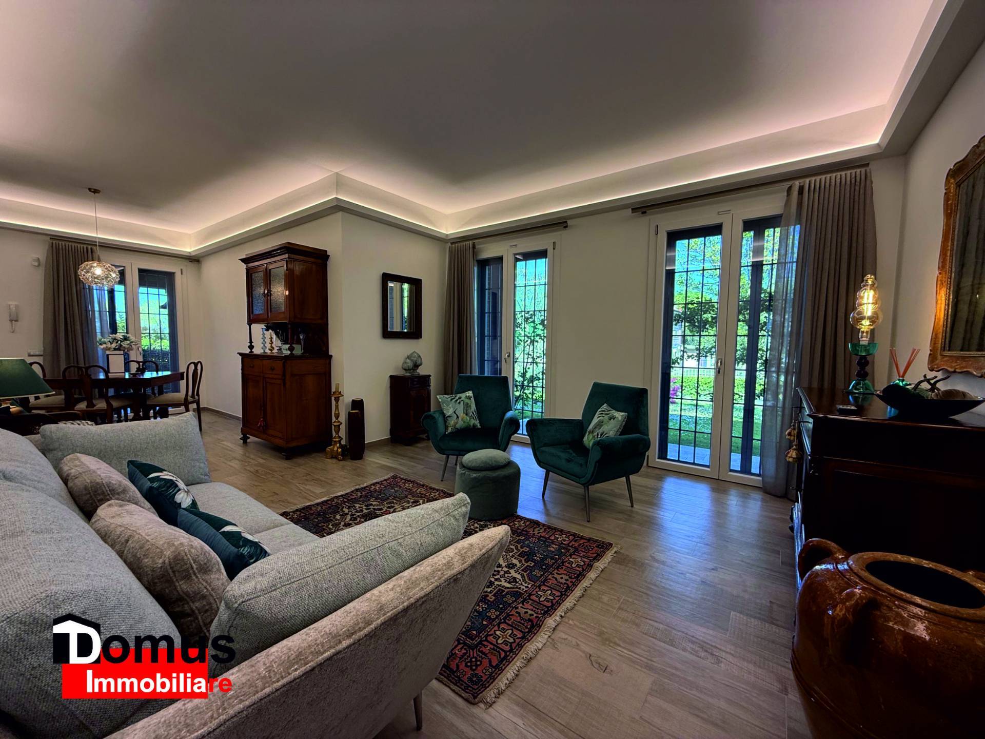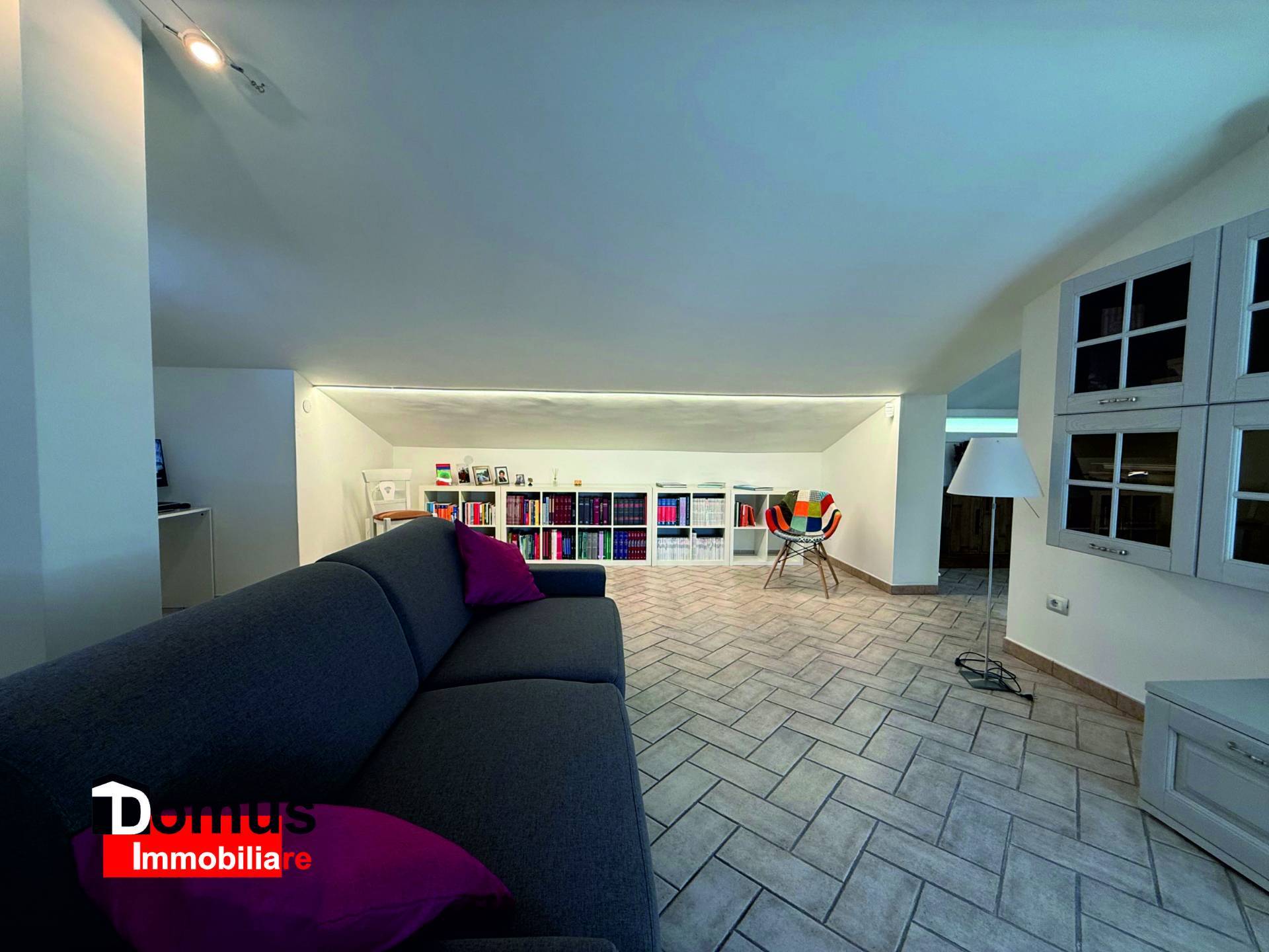 Disposto su tre livelli l'immobile è composto da ampio ingresso, spazioso salone articolato in diversi ambienti, tutti con affaccio sul giardino e sul porticato adiacente, cucina abitabile con office/ambiente di servizio lavanderia e balcone; il disimpegno notte padronale permette di accedere ad una tranquilla camera matrimoniale con guardaroba e bagno; al livello superiore ampia e luminosa mansarda utilizzabile come camera da letto o studio, alla quale sono abbinati bagno con doccia ed ampi ripostigli.